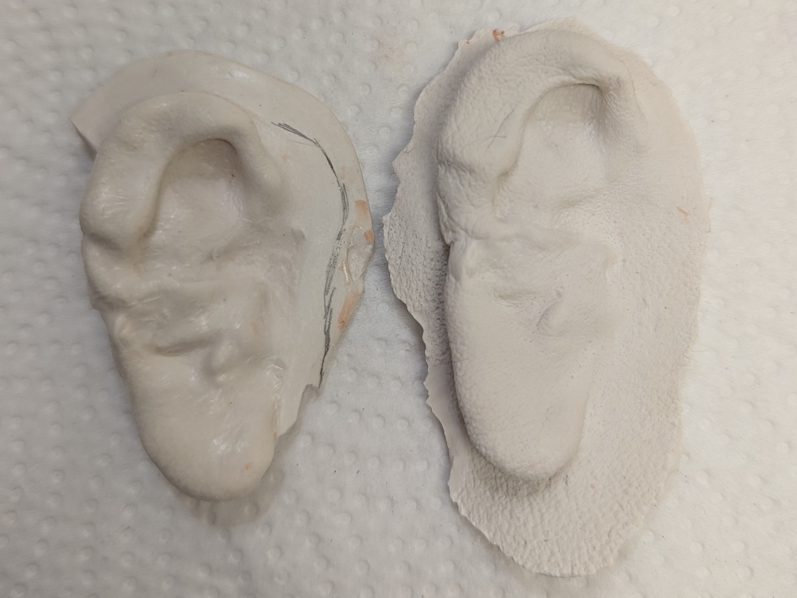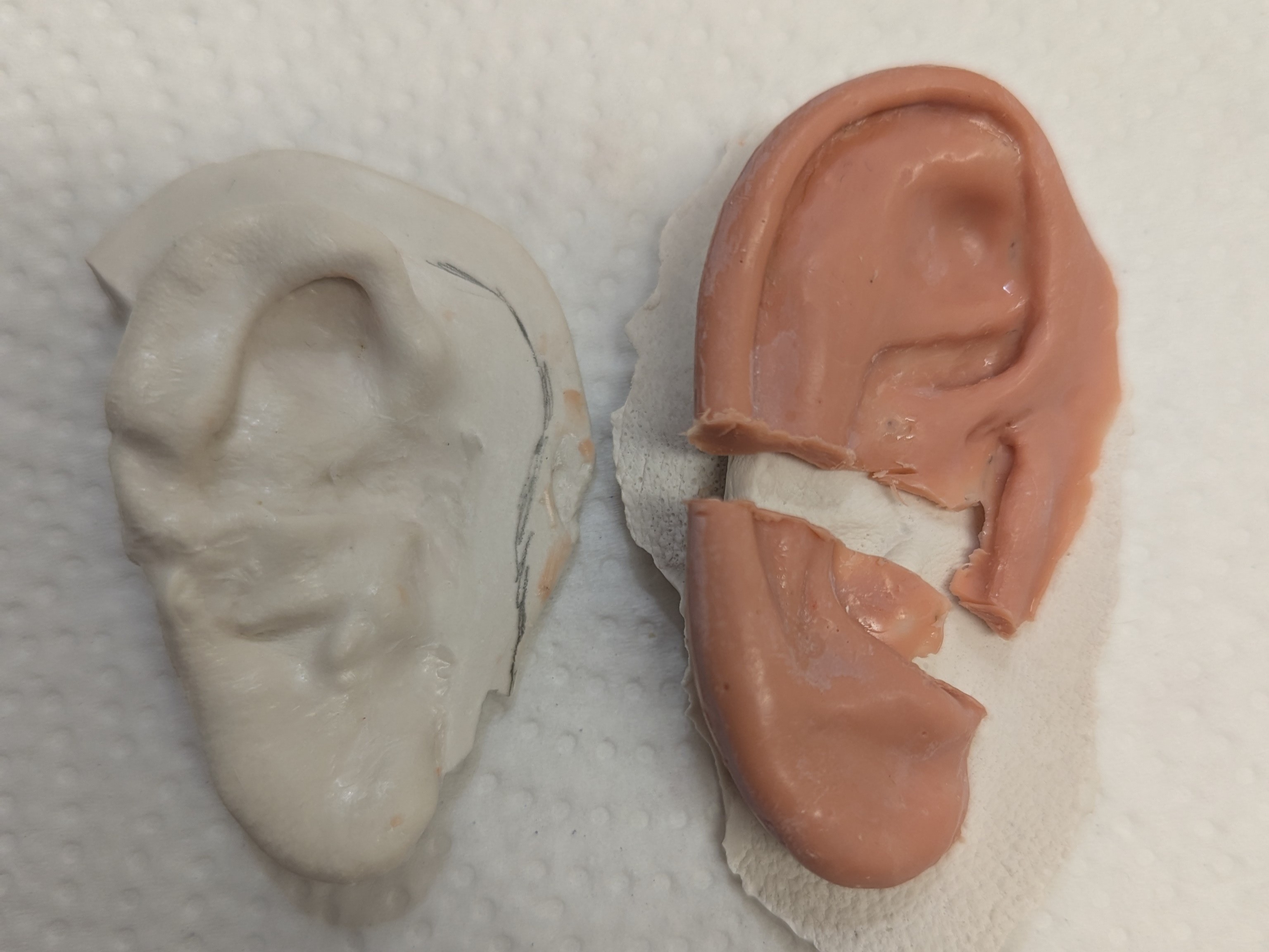 We got right up to speed quickly using Gabe’s original 22-year-old master mold which was safely archived. From the mold a wax prototype was processed faithfully capturing all the subtle details Gabe had sought after. It was then carefully aligned and adapted to the updated model of Gabe’s ear, since his own ear had increased in size and shape over the course of 22 years. See the photos of his ear from 2003 and 2025 below.
